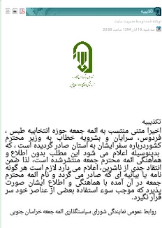 در این تکذیبیه آمده است: اخیراً متنی منتسب به ائمه جمعه حوزه انتخابیه طبس، فردوس، سرایان و بشرویه خطاب به وزیر محترم کشور درباره سفر ایشان به استان صادر شده است که بدینوسیله اعلام میشود این مطلب بدون اطلاع و هماهنگی ائمه محترم جمعه منتشر شده است.