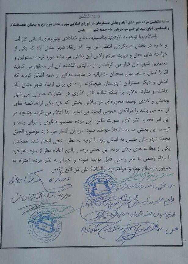 در ابتدای این بیانیه آمده است: «باتوجه به ظرفیتها، پتانسیلها، منابع خدادادی و نیروهای انسانی کارآمد و خبره در بخش دستگردان، انتظار این بود که ارتقای شهر عشقآباد که یکی از خواستههای بهحق و دیرینه مردم ولایی این بخش است، مورد توجه مسئولان و معتمدان شهرستان طبس قرار میگرفت و در سالهای گذشته این امر محقق میشد.»