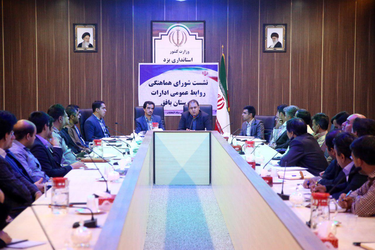 به گزارش کمیته تبلیغات و اطلاع رسانی ستاد انتخابات شهرستان بافق؛ نشست هماهنگی شورای روابط عمومی ادارات و نهادهای شهرستان بافق با حضور مدیرکل روابط عمومی استانداری یزد و فرماندار بافق در سالن اجلاس حضرت آیت الله حاج شیخ محمد تقی بافقی فرمانداری برگزار شد.