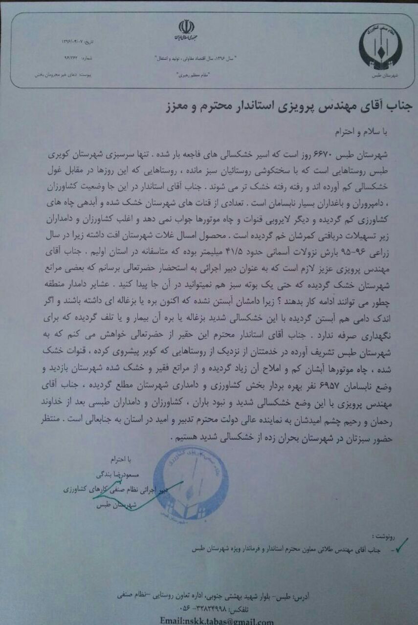 مسعود رضا بندگي در نامه اي ضمن تشريح مشكلات عديده اي كه گريبانگير فعالان بخش كشاورزي گرديده خواستار سفر پرويزي و بازديد وي از نزديك و البته تدبيري جهت مرتفع كردن اين مصائب شد.