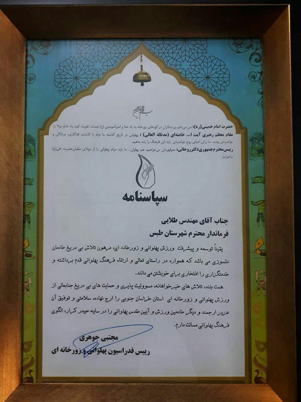 گفتنی است این سپاس نامه توسط اعضای هیات پهلوانی و زورخانه ای شهرستان طبس تقدیم ایشان گردید.