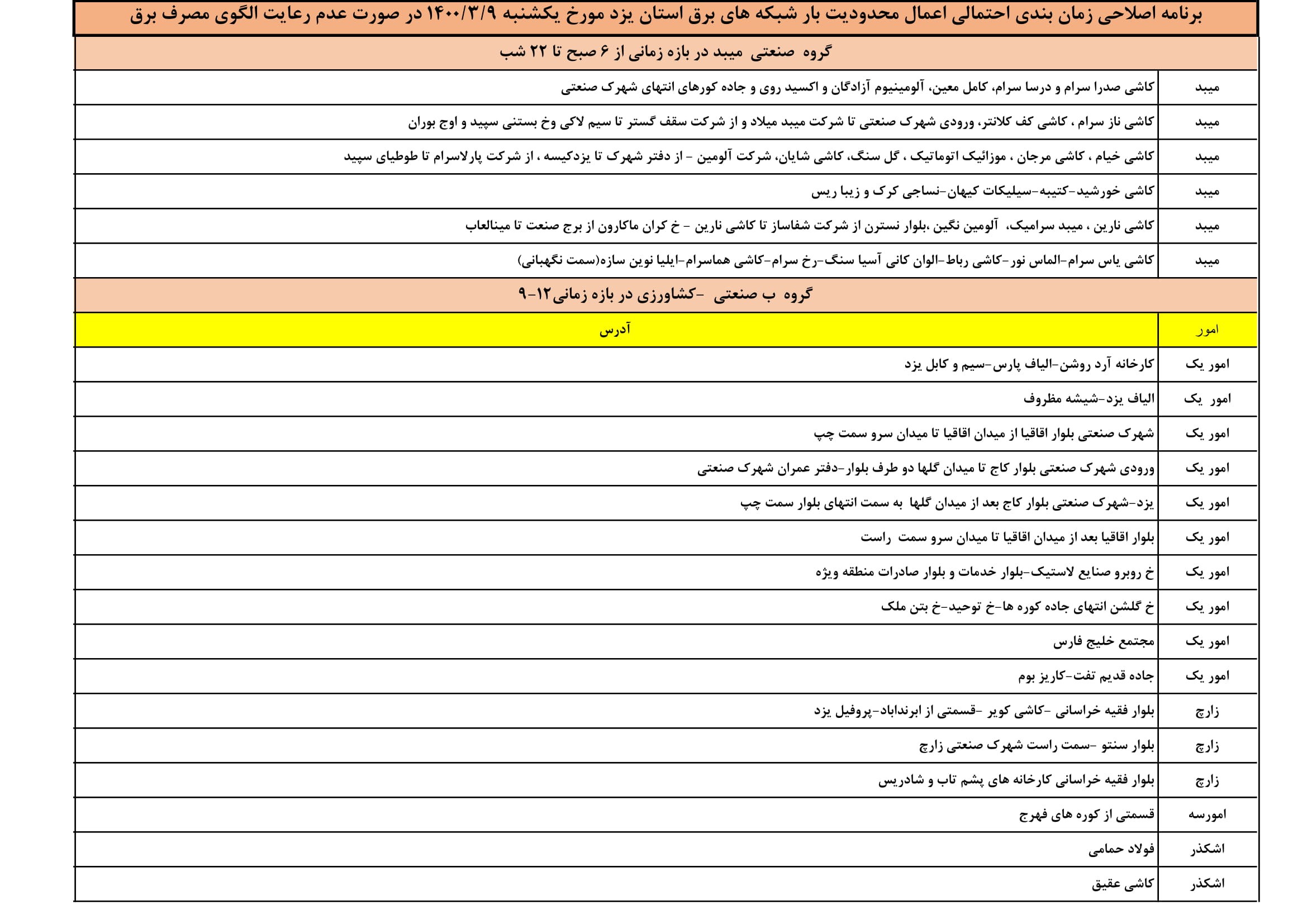 : برنامه قطعی برق یزد یکشنبه 9 خرداد 1400.