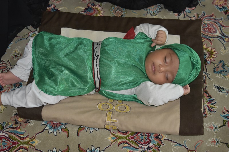 مادران سوگوار با بستن سربندهاي سبز و قرمز رنگ با عنوان يا حسين بر پيشاني شيرخوارگان خود به عزاداري براي سرور و سالار شهيدان ، اهل بيت عصمت و طهارت (ع) و شهداي كربلا پرداختند.
