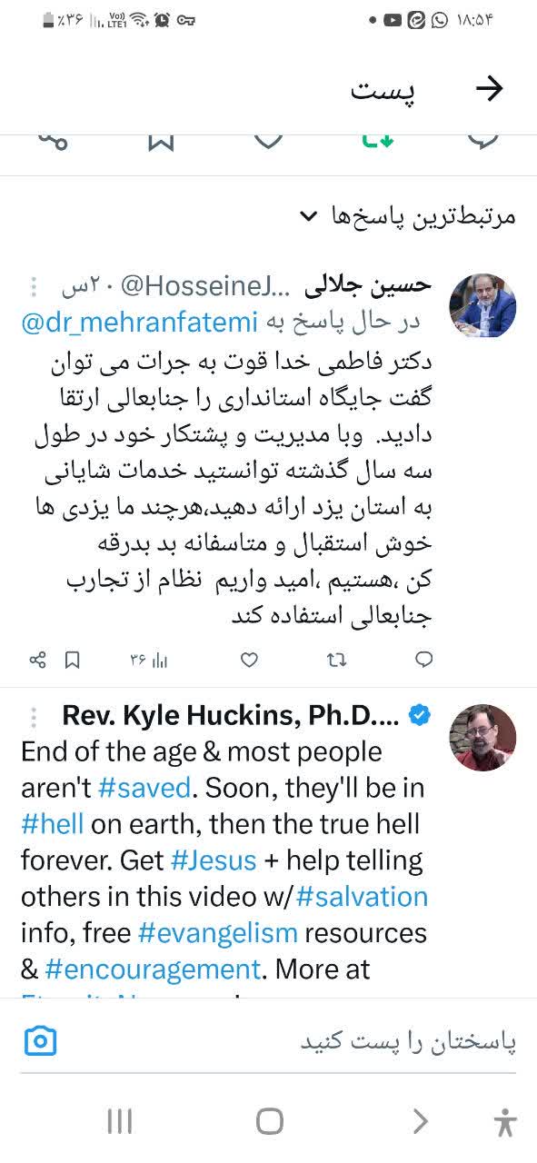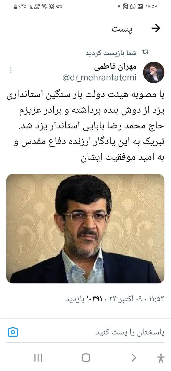 یزدفردا: جلالی در پاسخ به توییت دکتر مهران فاطمی که خبر از انتصاب دکتر بابایی به عنوان استاندار یزد داده بود نوشت: