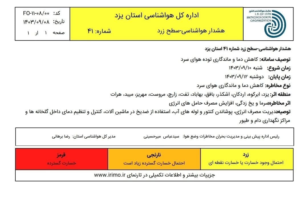 اداره کل هواشناسی استان یزد با صدور هشدار سطح زرد از کاهش دما و ماندگاری توده هوای سرد در استان یزد خبرداده است.