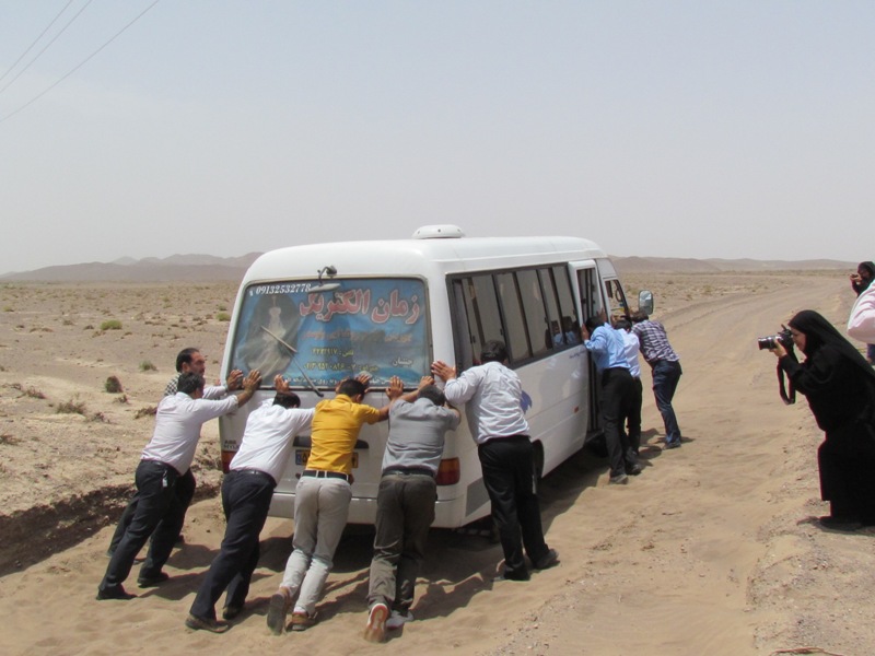 بعد از عبور از روستای چاه پی آپ در مسیر روستای خالی از سکنه چاه شور به دلیل خرابی راه مینی بوس حامل خبرنگاران در خاک می ماند که به وسیله خودروی دیگر کشیده شده و از خاک ها خارج می شود.