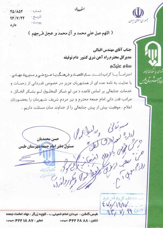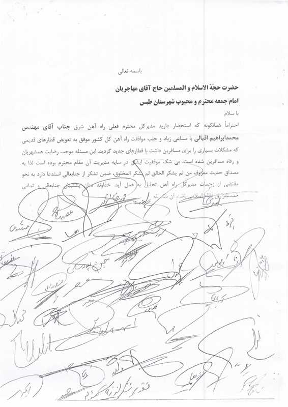 احتراما همانگونه که استحضار دارید مدیر کل محترم فعلی راه آهن شرق جناب آقای مهندس محمد ابراهیم اقبالی با مساعی زیاد و جلب موافقت راه آهن کل کشور موفق به تعویض قطارهای قدیمی که مشکلات بسیاری را برای مسافرین داشت با قطارهای جدید گردید. این مسئله موجب رضایت همشهریان و رفاه مسافرین شده است. بی شک موفقیت ایشان در سایه مدیریت آن مقام محترم بوده است لذا به مصداق حدیث معروف من لم یشکر الخالق لم یشکر المخلوق، ضمن تشکر از جنابعالی استدعا دارد به نحو مقتضی از زحمات مدیر کل راه آهن تجلیل به عمل آید. خداوند منان پشتیبان جنابعالی و تمامی خدمتگزاران نظام اسلامی باشد. انشاالله