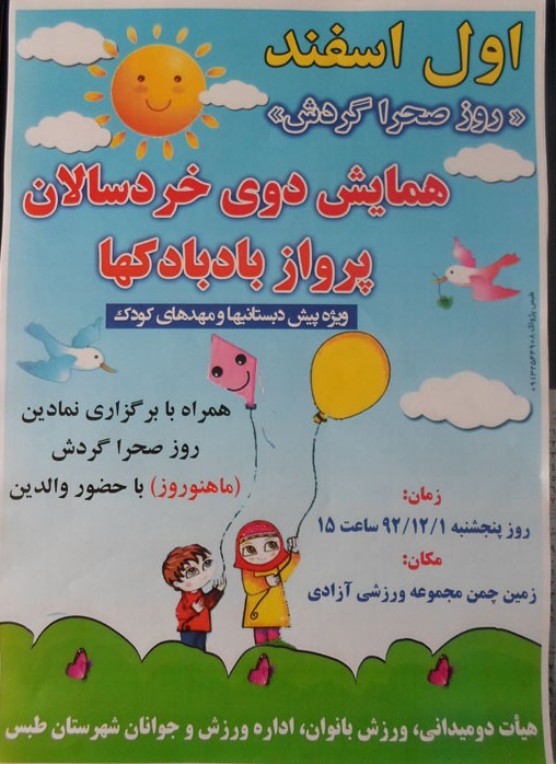 طبس- خبرنگار یزدفردا/ به مناسبت فرارسیدن یک اسفند( اول ماه نوروز) همایش دو خردسالان و پرواز بادبادکها همراه با مراسم صحراگردش برگزار خواهد شد.