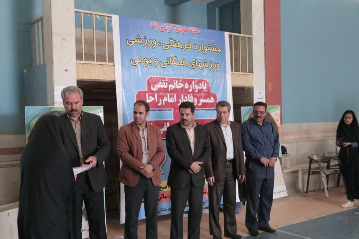 به گزارش روابط عمومي فرمانداري بافق ؛ اختتاميه نخستين جشنواره بازي هاي بومي محلي شهرستان بافق يادواره بانو ثقفي مادر شهيد و همسر مكرم امام راحل با حضور معاون فرماندار و جمعي از مسئولان محلي در سالن ورزشي هفتم تير برگزار شد.