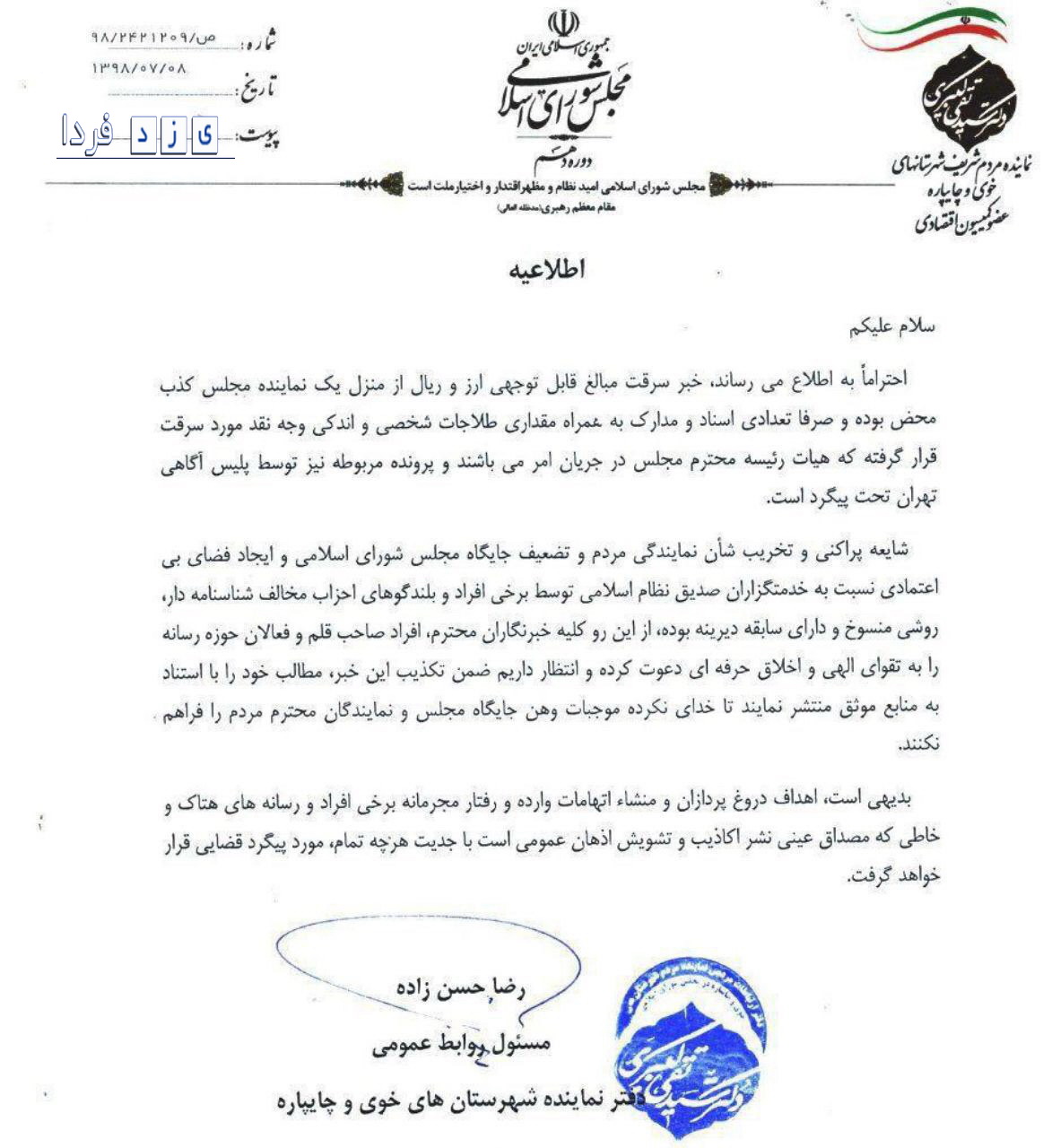 خبر اولیه این بود که «این نماینده مردم؟! مبلغ ۴۰۰میلیون وجه نقد و ۲۰۰هزار دلار را در منزلش نگهداری میکرده که اکنون طعمهی سارقین شده است»؛ هرچند بعدها خبر اصلاح شد، از این بابت که رقم بیشتری از آنچه ذکر شده بوده است! که این مسأله خود جای سؤال است!