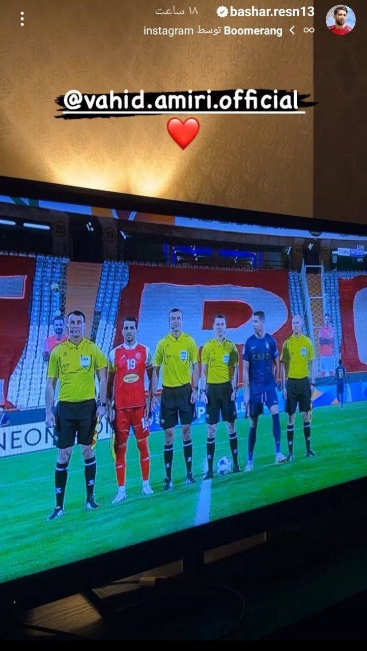ستاره سابق پرسپولیس که از طریق تلویزیون این دیدار را تماشا کرد، تصویری از وحید امیری در کنار کریستیانو رونالدو در مراسم ابتدای آن دیدار را در صفحه شخصیاش در فضای مجازی منتشر کرد.