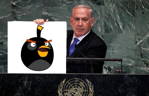 اين سخنان حتي توسط كاربران ديگر كشورها نيز با واكنشهاي طنزمابانهاي روبرو شد و كاربران جهان اينترنت، با به تصوير كشيدن حركات مضحكانه نتانياهو، به استقبال از سخنان وي پرداختند. در زير، نمونههايي از اين تصاوير طنز را ملاحظه مي فرماييد: