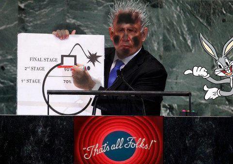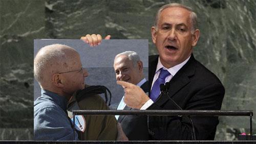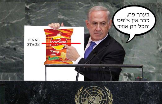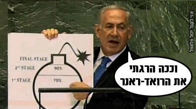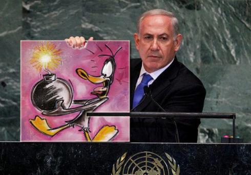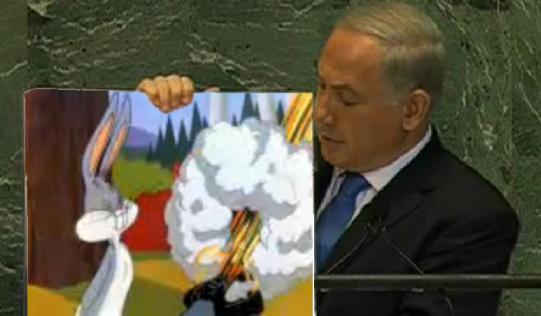 به گزارش بولتن نيوز وی كه براي تشريح سخنان ضد ايراني خود، متوسل به تصويري شده بود با نشان دادن آن تصویر توضیح داد که برنامه اتمی ایران ۷۰ درصد از مراحل لازم برای ساخت بمب را طی کرده است و جامعه جهانی باید خط قرمز روشنی برای تهران ترسیم کند تا ایران به آستانه ساخت بمب نرسد.