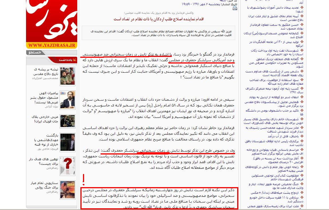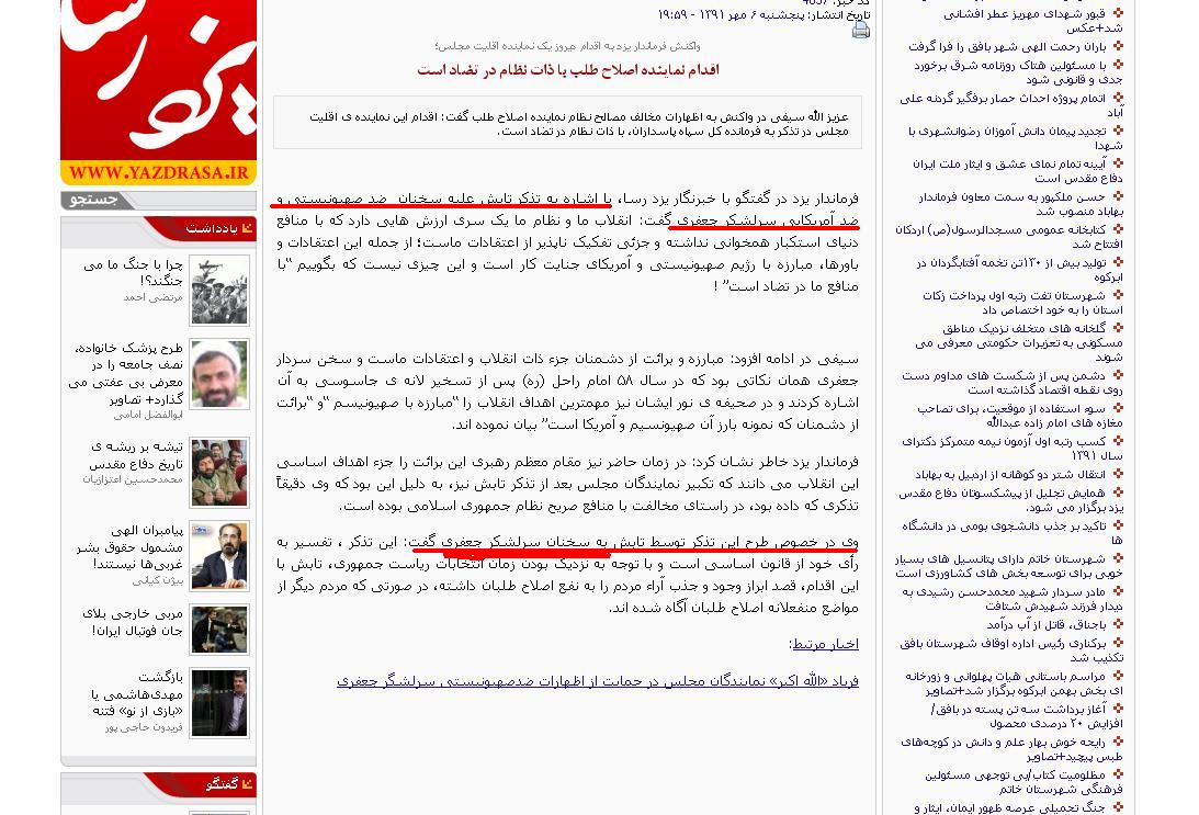 و از همه جالبتر اینکه امروز خبری بر خروجی این سایت می رود با این عنوان"موج اعتراضات مردم و مسئولین نتیجه داد؛عدول تابش از مواضع خود در مقابل فرمانده کل سپاه" و از این طور توضیح می دهد: در پی موج اعتراضات مردم!! و مسئولین!! علیه اظهارات اخیر تابش، وی از مواضع قبلی خود در مقابل فرمانده سپاه عدول کرد و سخنان تهدیدآمیز نتانیاهو را طبلی تو خالی خواند."