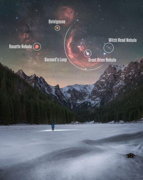 در سمت چپ، «سحابی گل سرخ»(Rosette Nebula) به آرامی می‌درخشد. «سحابی سر جادوگر»(Witch Head Nebula) به رنگ خاکستری در سمت راست دیده می‌شود و با نور ستاره‌های نزدیک روشن شده است. نزدیک به بالای عکس، ستاره «ابط‌الجوزا»(Betelgeuse) به رنگ نارنجی، شانه شکارچی را نشانه گرفته است.